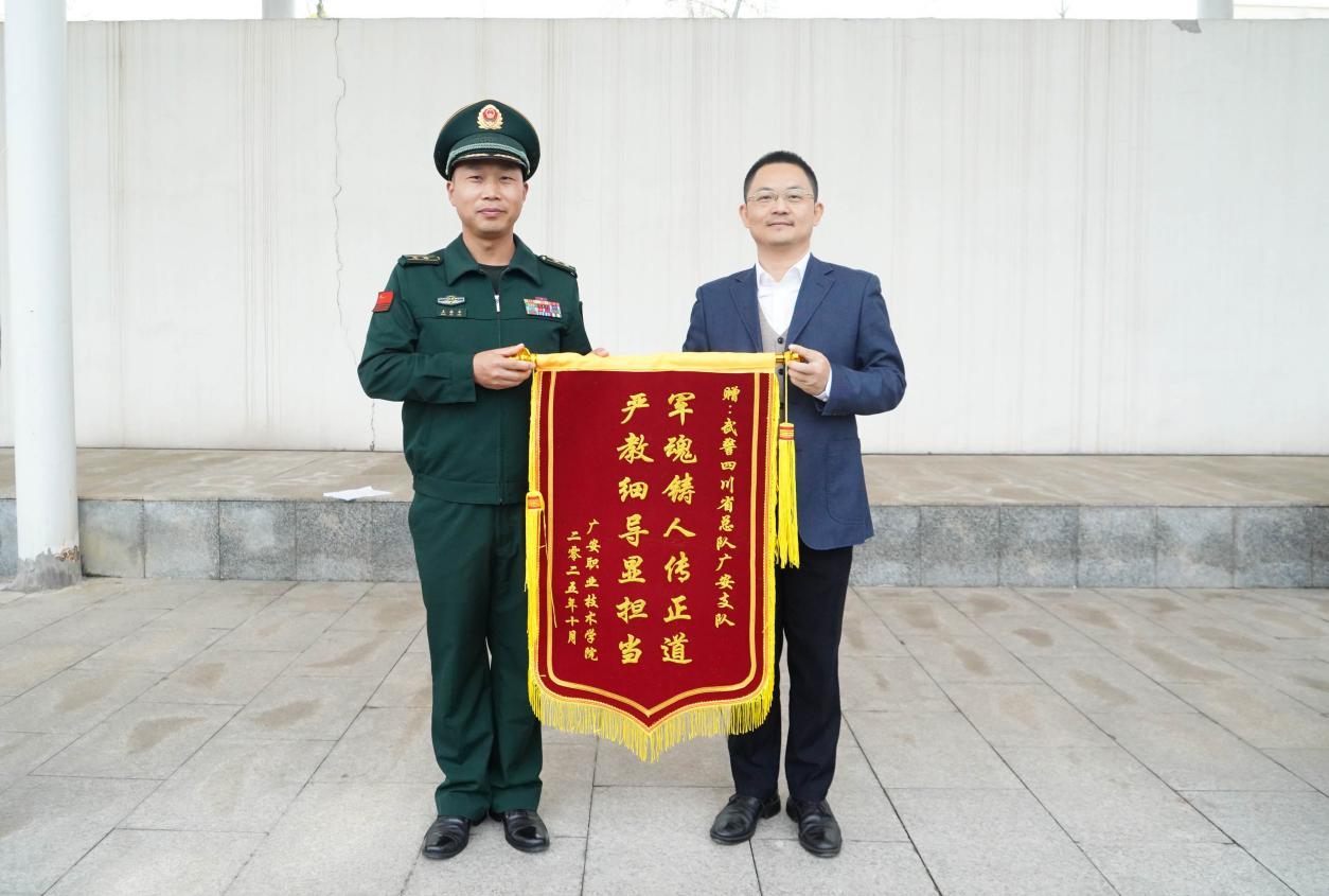 王义全、陈鹏代表学校党委、行政,向关心和支持学校军训的广安军分区、武警广安支队、广安区人民武装部表示衷心感谢,向为本次军训付出辛勤汗水的全体教官、老师们致以崇高敬意,向在军训中取得优异成绩的集体和个人表示热烈祝贺,并分别向广安区人民武装部、武警广安支队赠送了锦旗。