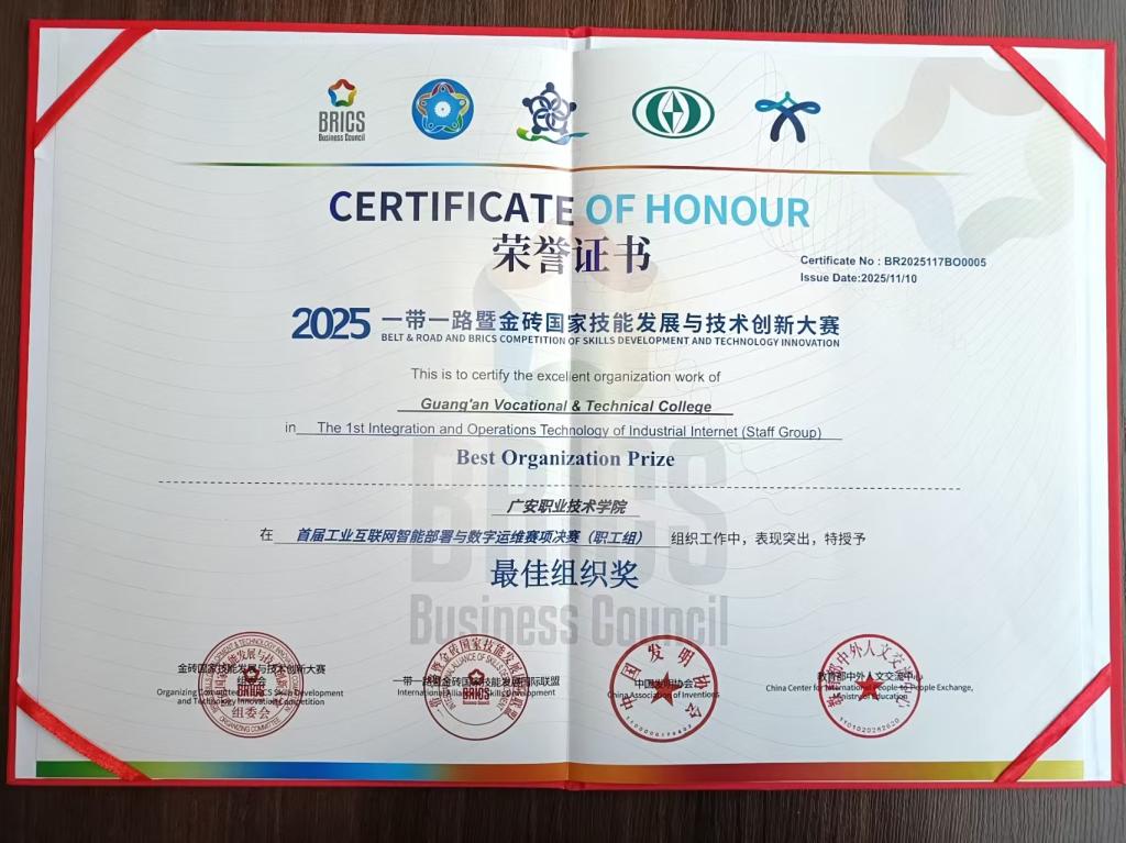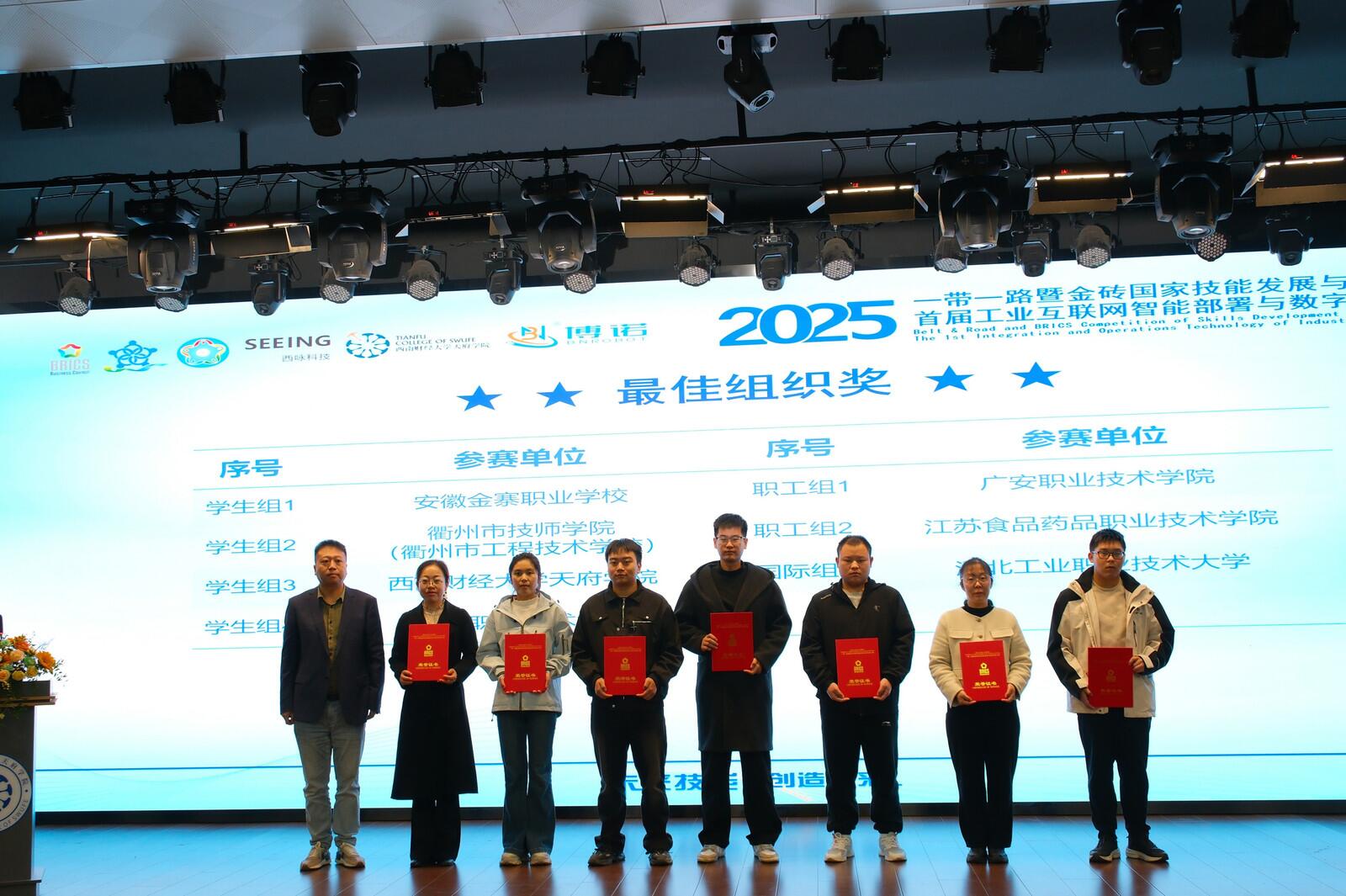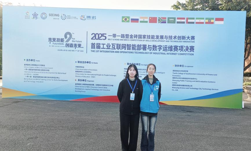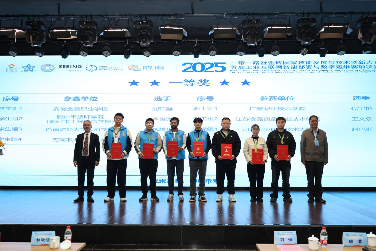近日,由金砖国家工商理事会中方理事会、一带一路暨金砖国家技能发展国际联盟、“一带一路”暨金砖国家技能发展与技术创新培训中心主办,金砖国家工商理事会技能发展、应用技术与创新中方工作组共同承办的2025一带一路暨金砖大赛首届工业互联网智能部署与数字运维赛项决赛在绵阳西南财经大学天府学院圆满落幕。我校参赛团队在该赛项中发挥出色,职工组斩获金奖1项,学生组斩获银奖1项,展现了我校在工业互联网、智能制造等领域的扎实教学水平和学生卓越的创新实践能力。