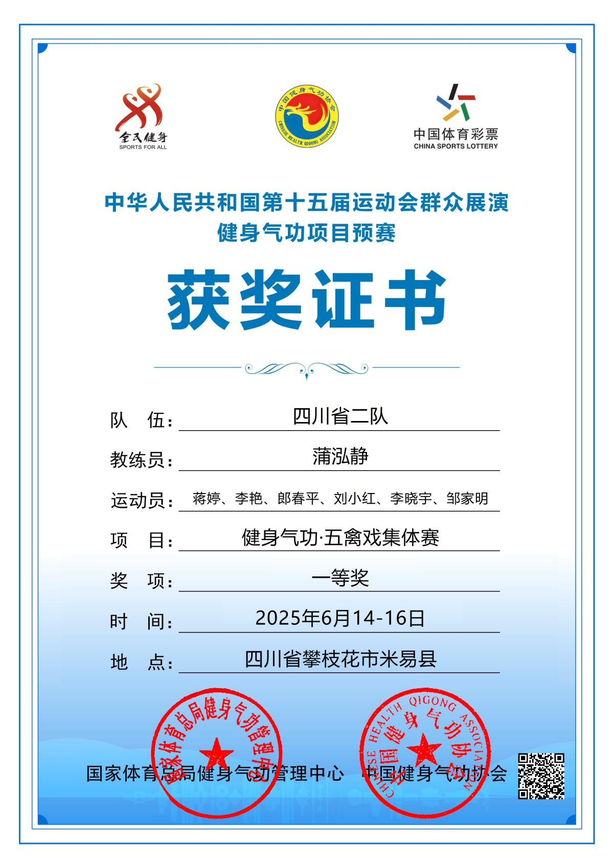 与此同时,专业教师在高水平赛事指导中再添亮眼成绩。2025年6月,我校社会体育专业教师蒲泓静受四川省社会体育指导中心聘请,以教练员身份指导四川省二队,参与中华人民共和国第十五届运动会群众展演健身气功项目预赛。在其专业指导下,四川省二队在健身气功・五禽戏集体赛中表现出色,斩获一等奖,成功入围决赛,充分展现了我校教师在体育专项指导领域的过硬专业素养。
